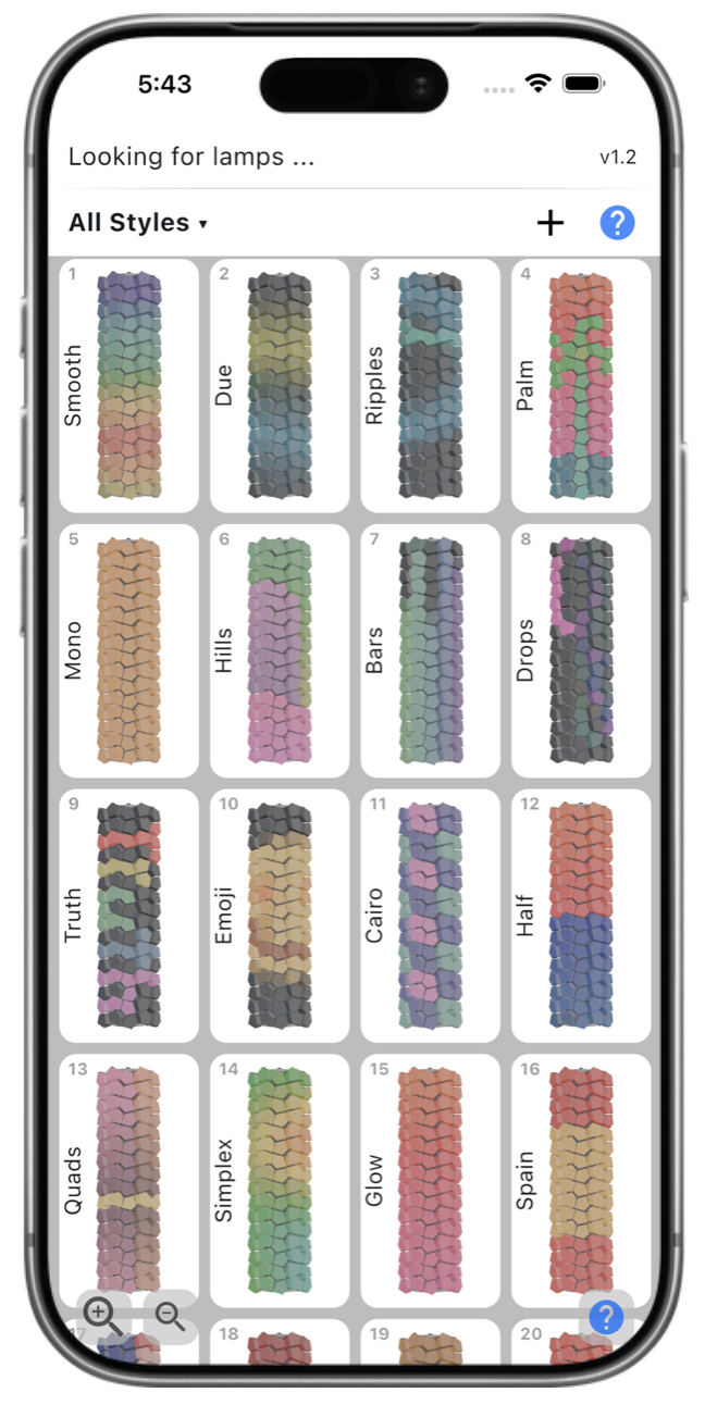The lamp continuously cycles through a number of different light animation patterns. You can select to play all patterns or just select your favorites.